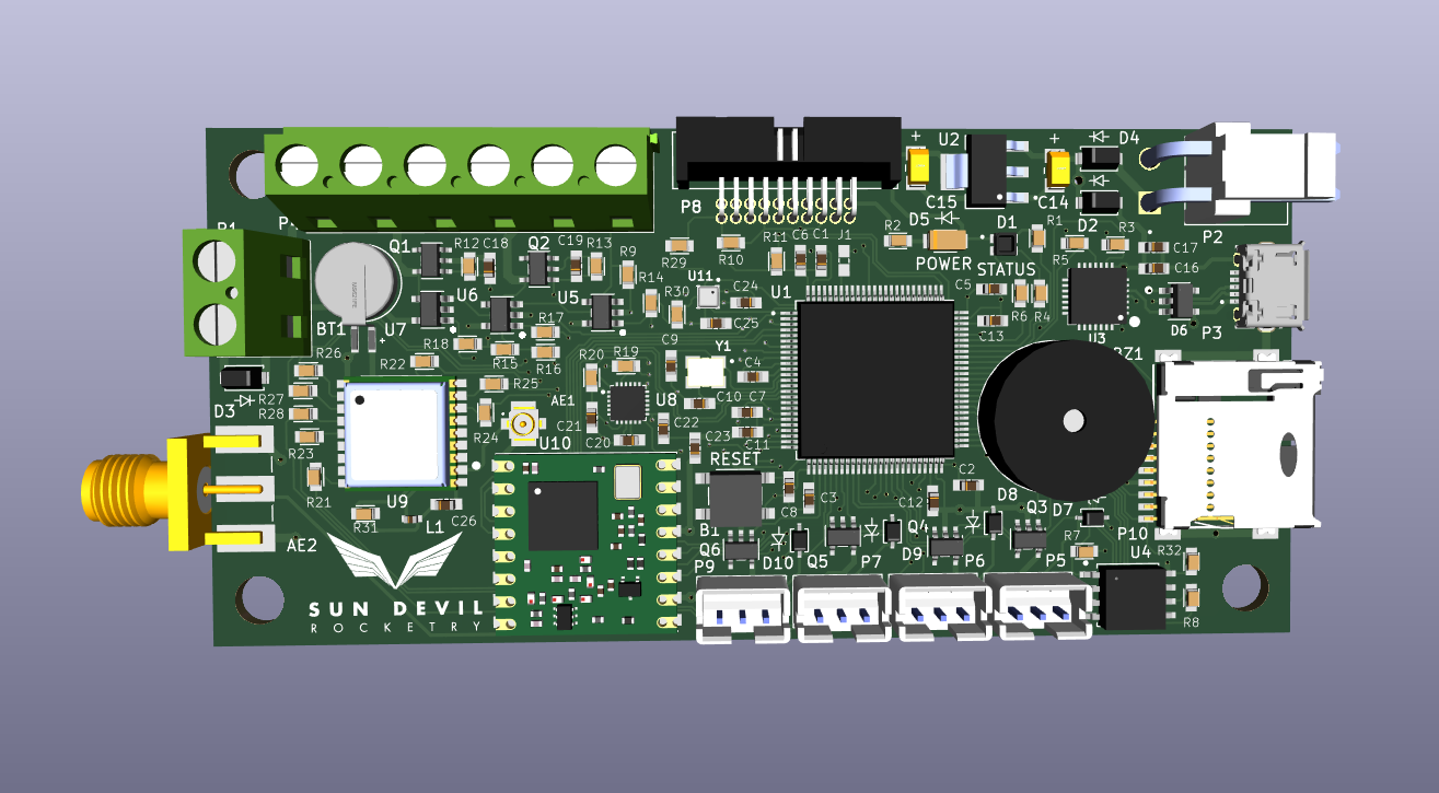 The flight computer is the main focus of my work with Sun Devil Rocketry. The first two revisions were originally designed by Colton Acosta, the founder of the avionics team at SDR. In amateur rocketry, there are a number of different types of consumer avionics available. All of these have differing levels of capability, from the simplicity and reliability of EasyMinis to more advanced, full feature packages like the Fluctus. The Sun Devil Rocketry Flight Computer was designed and built in-house to be on the full-feature end of the scale and allow us to customize it for the needs of the club.